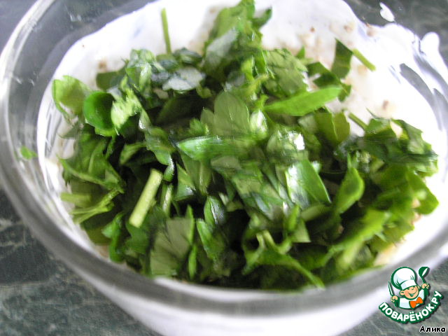 Мелко нарезать кинзу (если не любите ее, можно взять петрушку). Смешать зелень, грецкие орехи, сметану, подсолить, поперчить. Начинка готова.
