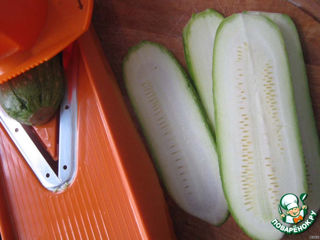 Сначала я решила потренироваться в нарезке кабачка на тёрке "бёрнер". Ибо, в случае неудачи, делать эту закуску не было бы смысла. Спасибо Ларисочке - Ларек, она просветила меня, как это делать. Это оказалось элементарно просто, радости моей не было предела, так как получилось всё с первого раза.
