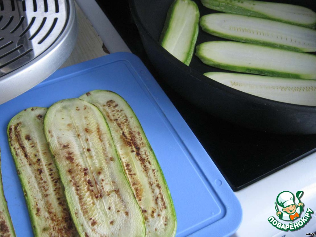 Кабачки нужно обжарить, лучше на гриль-сковороде, но у меня такой нет (надо заказать мужу к 8 Марта), а лучше электро-гриль. Обжариваем на сухой сковороде на сильном огне. На это уходит по 2 минуты с каждой стороны.