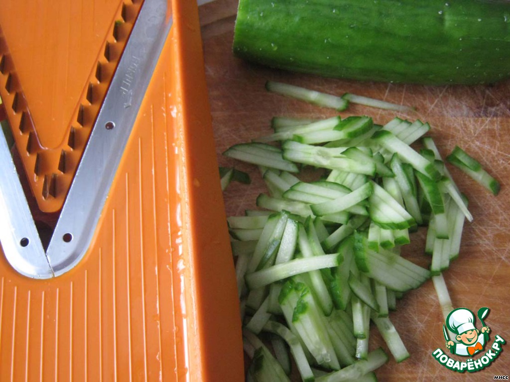 На тёрке тонко шинкуем огурец.