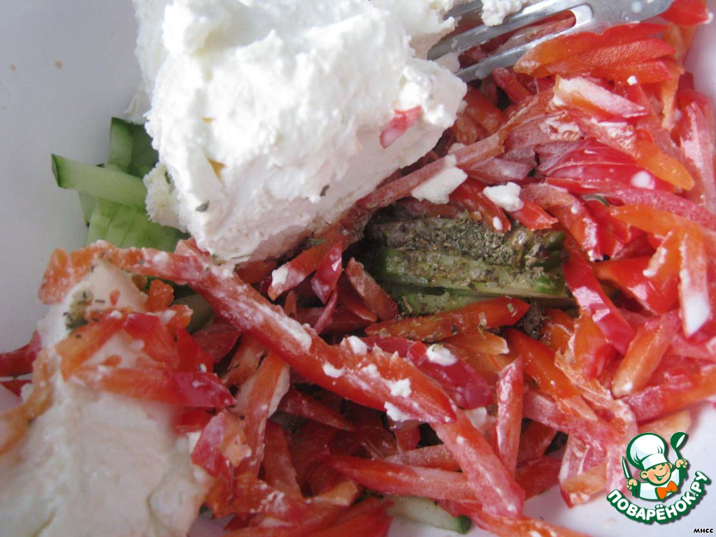 Смешиваем овощи, приправу, добавляем "Филадельфию", получается густовато, немного разводим сливками.