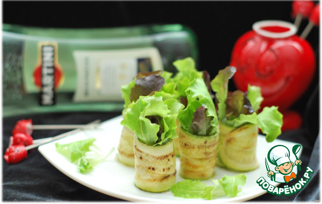 Берём обжаренную полосочку кабачка. На край кладём несколько листиков салата, чтобы они "торчали сверху", кладём ложку овощей, и опять несколько листиков салата и заворачиваем.