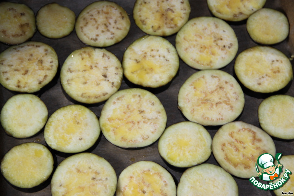 Баклажаны нарезать колечками толщиной 0,7-1 см. Выложить на бумагу для выпечки, смазать с помощью кисточки растительным/оливковым маслом и слегка посолить. Выпекать в разогретой духовке 20 минут.