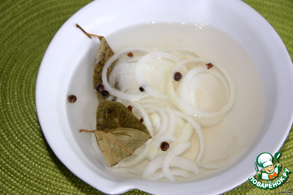 Лук нарезать кольцами и замариновать на 3 - 5-6 минут. Маринад - уксус, перец горошком, душистый перец, гвоздика, лавровый лист + горячая вода. Время маринования определит хрусткость лука и уберёт горечь.
