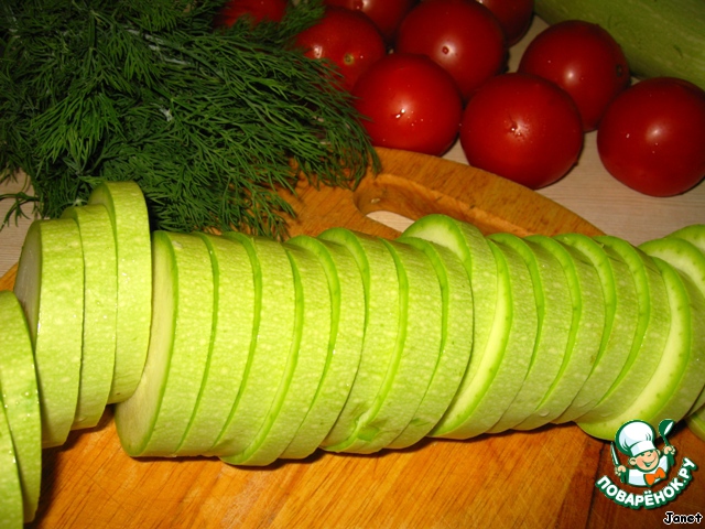 Кабачки нарезаем кружочками, толщина примерно 0,5 см.