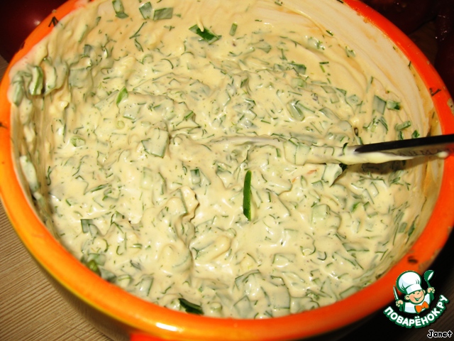 Приготовим соус из майонеза, чеснока, зелени (какая имеется: укроп, петрушка).