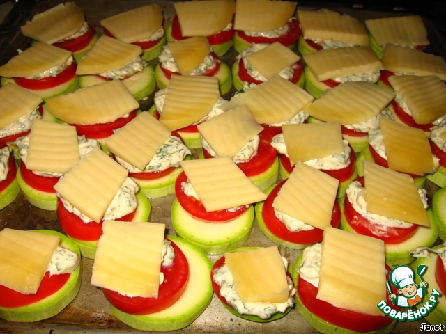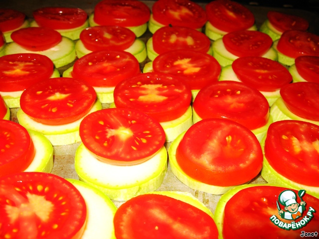 Противень смазать растительным маслом, выложить кружочки кабачков, на них помидорчики.