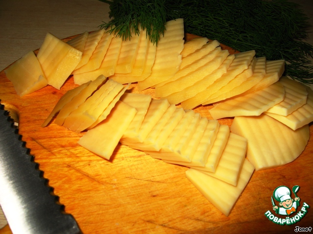 Сыр, обязательно твёрдый, режем пластинками примерно 4х3 или 4х4.