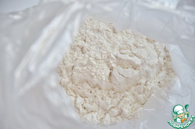 В целлофановый пакет кладём муку и оставшуюся соль.