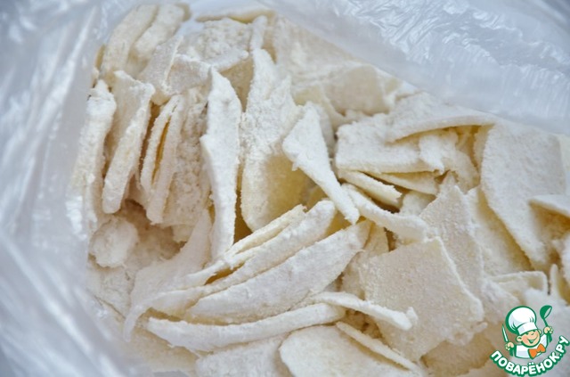 Кладём туда же картофель и очень хорошо встряхиваем пакет, чтобы каждая заготовка для чипсов была вся в мучной смеси.