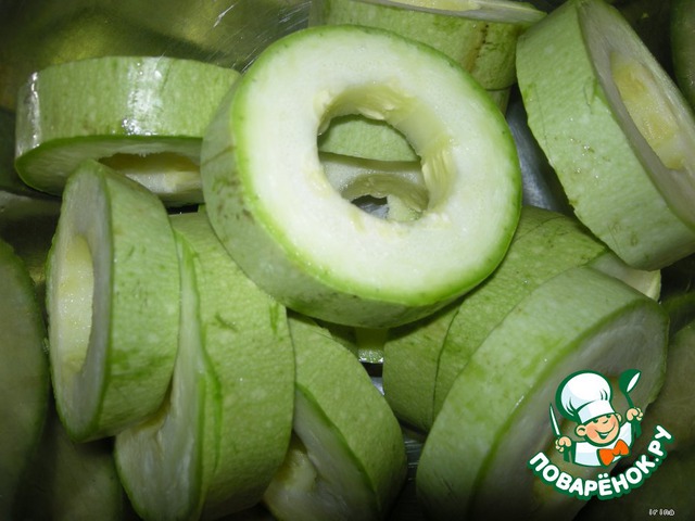 Кабачки нарезаем толстыми колечками примерно 1 см толщиной.
