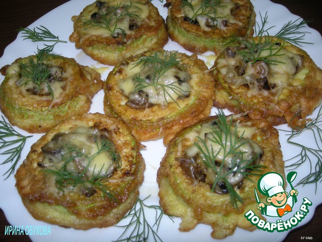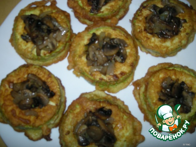 Измельченные грибочки обжариваем с мелко нарезанным луком. Фаршируем этой начинкой кабачки,