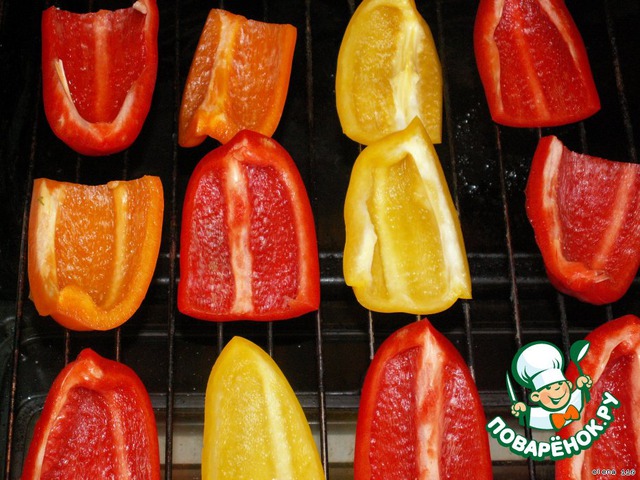 Перцы очистить, порезать каждый перец на несколько половинок и запечь в духовке на решeтке при 200 градусах 45 -50 минут.