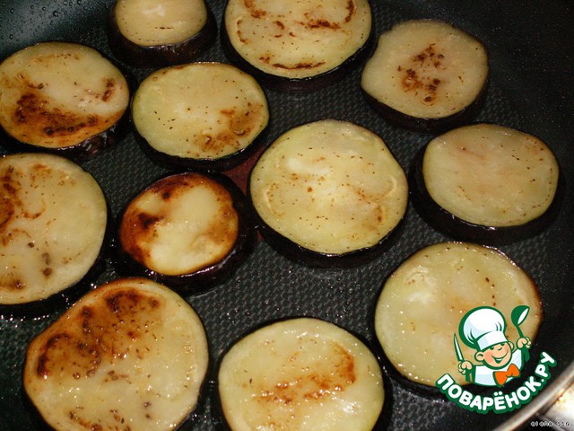Баклажаны порезать колечками, положить в солeную воду и оставить на час. Воду слить, баклажаны отжать руками и обсушить на салфетке.
