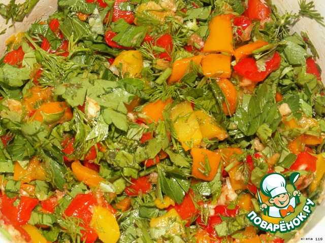 Смешать перец с чесноком (через чеснокодавилку), добавить зелень, посолить, поперчить.