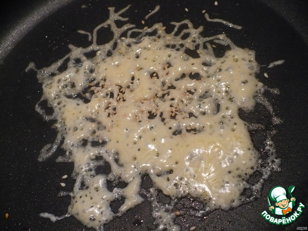 Натираем мелко сыр. Идеально подойдет пармезан - после застывания получается очень ажурно и хрустяще, но мне сегодня не повезло. Гауда, так гауда, переживем. Берем ТЕФЛОНОВУЮ сковородку, нагреваем, посыпаем чуток кунжутом, ждем, пока начнет зарумяниваться и добавляем сыр.