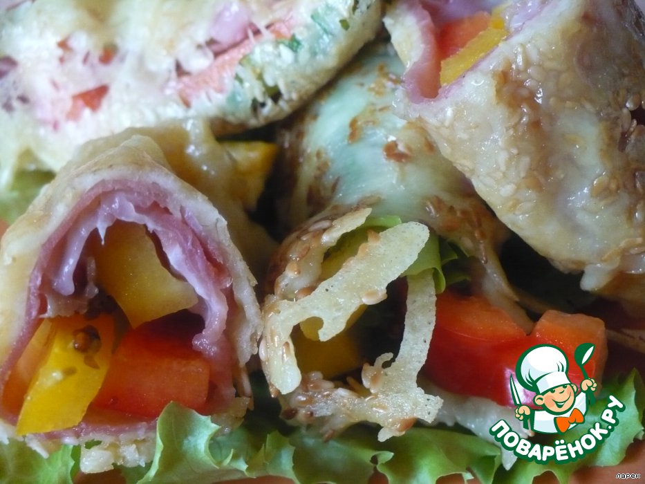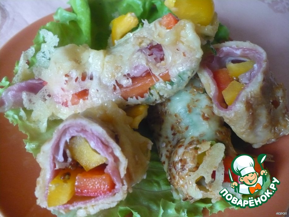 Остужаем, выкладываем на тарелку на листья салата. Можно разрезать на две части. Все! Можно закусывать!