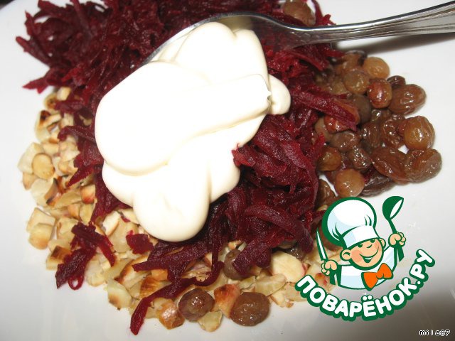 Смешиваем все необходимое для красных шариков заправляем майонезом, тщательно перемешиваем.