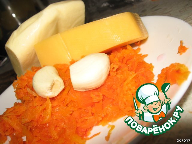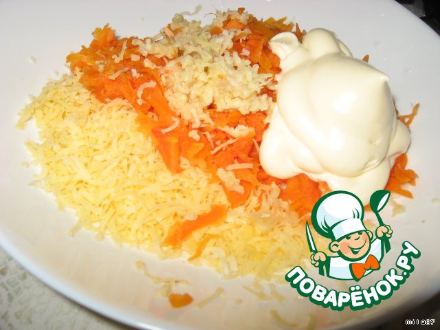Натираем на терке морковь, два вида сыра и чеснок. Заправляем все майонезом и смешиваем тщательно до однородной массы.