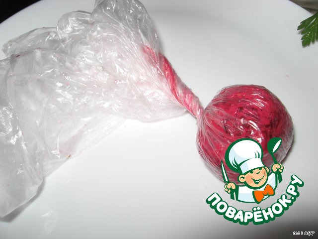 При помощи пленки формируем шарик: на середину пленки выкладываем смесь из ложки, помогая пальцами делаем шарик, затем закручиваем края пленки.