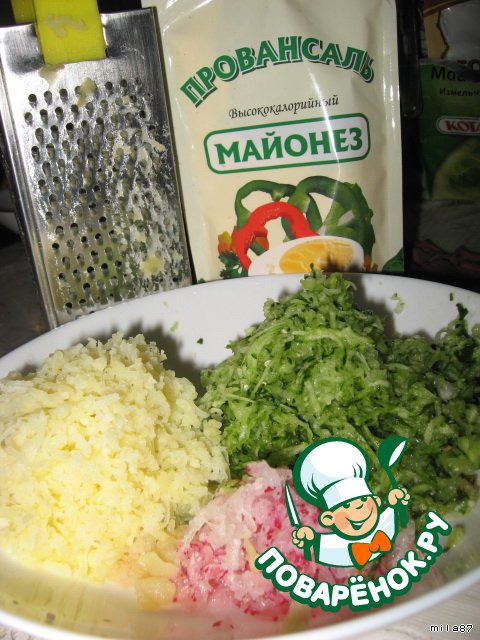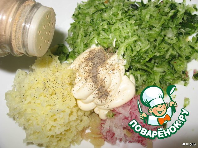 Трем на терке картофель, редис и огурчики (отжимаем сок с огурцов).