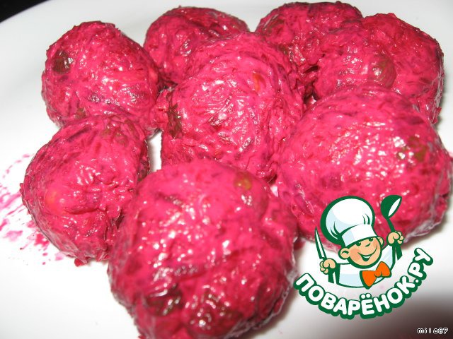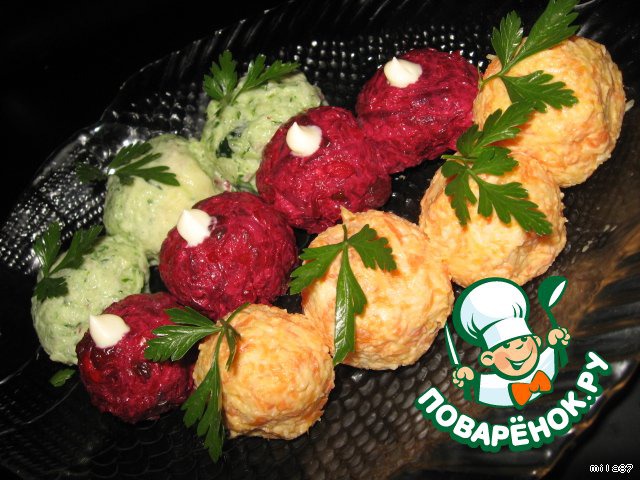 | Невероятная простая... нарядная закуска... на тот случай, чтоб "угодить всем". Красные шарики из свеклы, изюма и орехов порадуют милых дам своим сладко-ореховым вкусом... Морковные шарики с добавлением чеснока и сыра порадуют мужскую половину своей остротой и приятным вкусом... ну а зеленые шарики из огурца, редиса и картофеля никого не оставят равнодушным своим свежим вкусом.... Вот так все до боли знакомо и невероятно вкусно!!!! На конкурс "Овощной светофор"... |