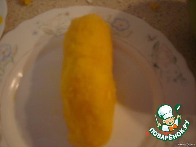 Сыр фета потереть на терке, добавить душицы, болгарский перец перемолоть на блендере, отжать сок и нанести на уже приготовленный початок из сыра, ножом сделать насечки, придать вид кукурузки. Порезать на кусочки и полить оливковым маслом. Угощайтесь!