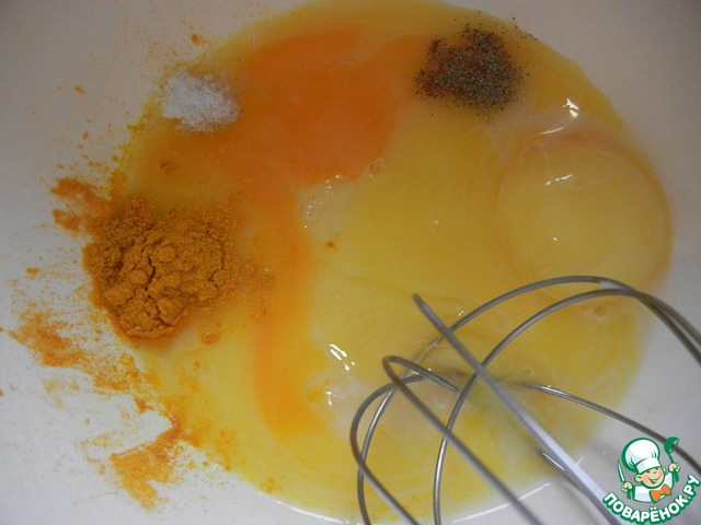 Отделяем белки от желков. Затем взбиваем желтки, куркуму, соль, перец и остывшую морковь.