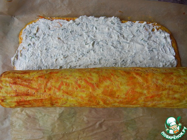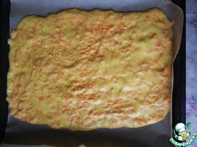 Отдельно взбиваем белки до устойчивой пены, добавляем к морковке и аккуратно перемешиваем. Застилаем противень пекарской бумагой и выкладываем морковную массу в виде прямоугольника размером 20х30 см. Выпекаем в предварительно разогретой до 180 градусов духовке 15 минут.