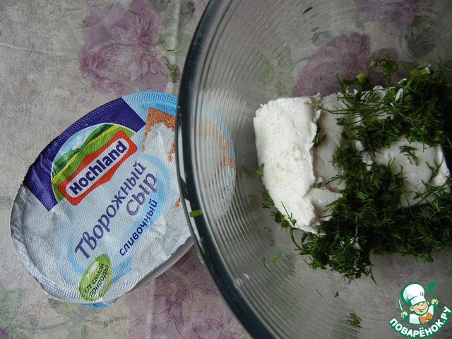 Пока наша основа запекается, приготовим начинку. Взбиваем блендером творог, укроп, чеснок (по желанию, можно без него) и творожный сыр.