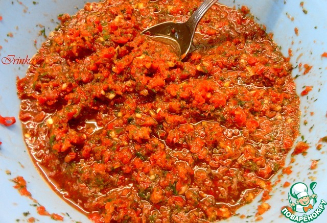 Пропускаем через мясорубку два красных сладких перца, два стручка горького перца, две головки чеснока, пучок петрушки и укропа. На этом этапе можно попробовать смесь на жгучесть.