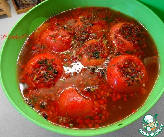 Горячим рассолом заливаем помидоры так, чтобы они были только покрыты; затем миску надо немного потрясти.