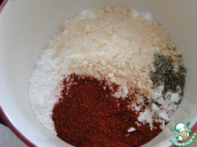 Яйца взболтать с молоком, отставить. В другой миске смешать муку, пармезан, паприку, орегано, соль.