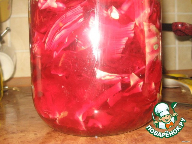 Для маринада все смешать, довести до кипения и залить капусту. Поставить в прохладное место. Готова через сутки, даже немного раньше. Потом можно хранить в холодильнике. Приятного аппетита!!