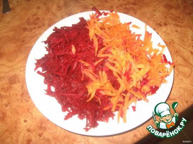 Капусту режем большими кусками, около 3 - 4 см. Свеклу и морковь трем на крупной терке. Складываем в банку капусту, пересыпая морковно-свекольным слоем.