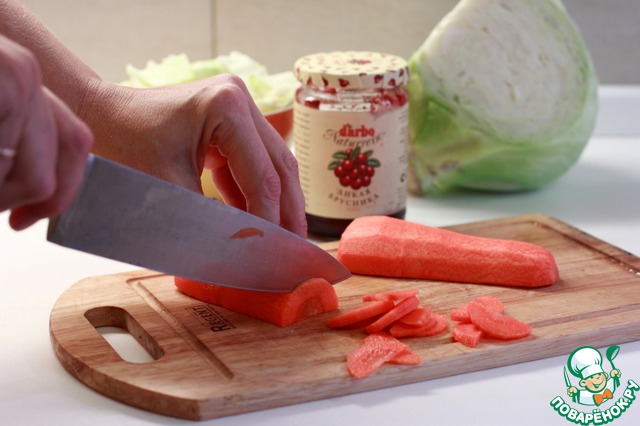 Я, для разнообразия, нарезала еще немного краснокочанной капусты. В салате такая разноцветная капуста будет смотреться очень здорово.