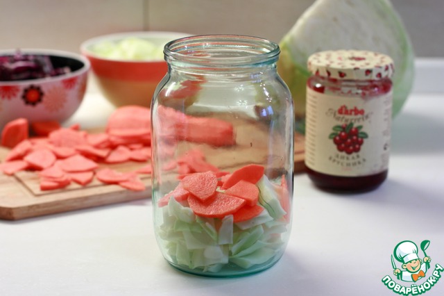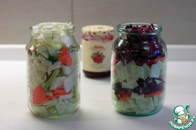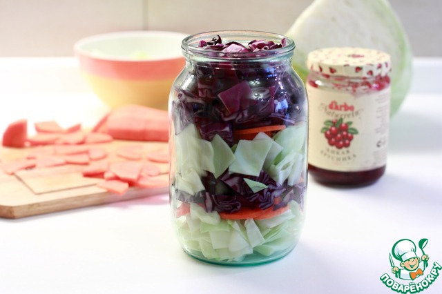 В другую банку я положила слой белокочанной капусты, морковь, чеснок, слой краснокочанной капусты.