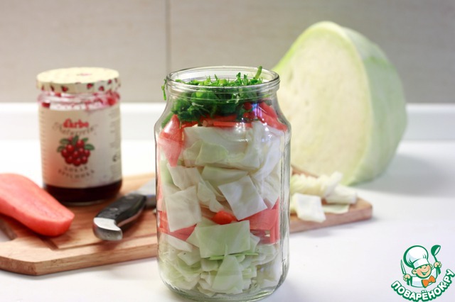 В банку сложить слоями - капусту, морковь, чеснок, петрушку. Слои повторить.