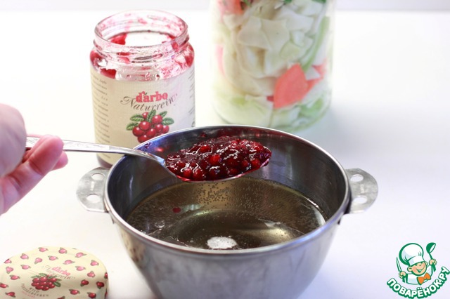 Приготовить маринад. Воду вскипятить, всыпать соль и сахар, дождаться полного растворения, влить растительное масло, довести до кипения. Снять с огня, влить уксус и добавить брусничный соус.
