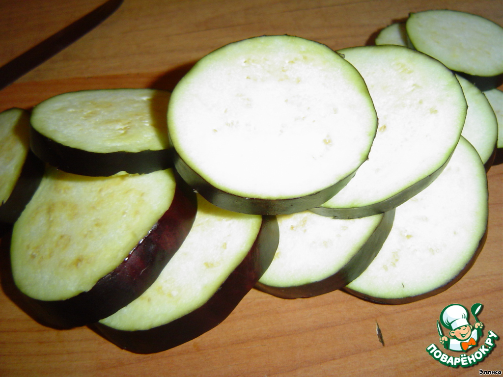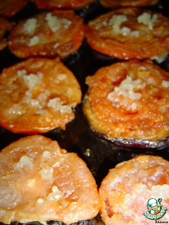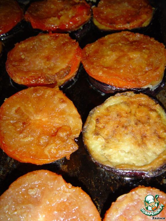 На противень, смазанный растительным маслом, выкладываем кружочки баклажанов,