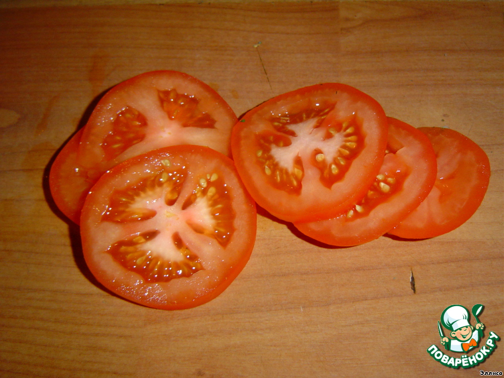 Сверху кладем кружочки помидоров, также перчим и посыпаем чесноком и измельченной зеленью петрушки, все это накрываем кусочками сыра и запекаем в духовом шкафу при температуре 180-190*С до золотистого цвета.