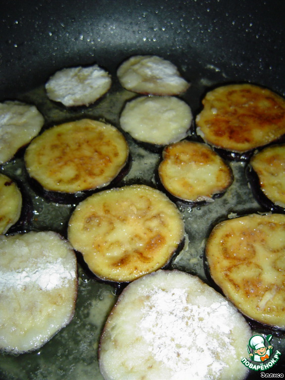 Кружочки баклажанов и помидоров обмакиваем в муку и обжариваем на растительном масле до золотистого цвета.