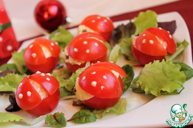 Наполняем наши помидоры рaзными начинками. Глазки делаем из гвоздики. Крылышки из половинок помидор кладём сверху. И рисуем майонезом точки. Готовые "Божьи коровки" выкладываем на блюдо с зеленью.