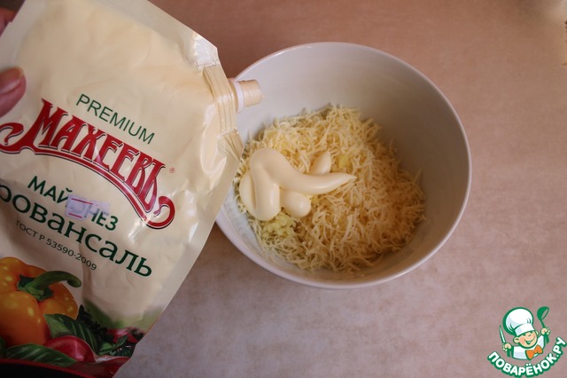 Делаем первую начинку. Ну тут все просто, сыр натираем на мелкой терке, добавляем выдавленный чеснок и 2 ложки майонеза. Все размешаем.