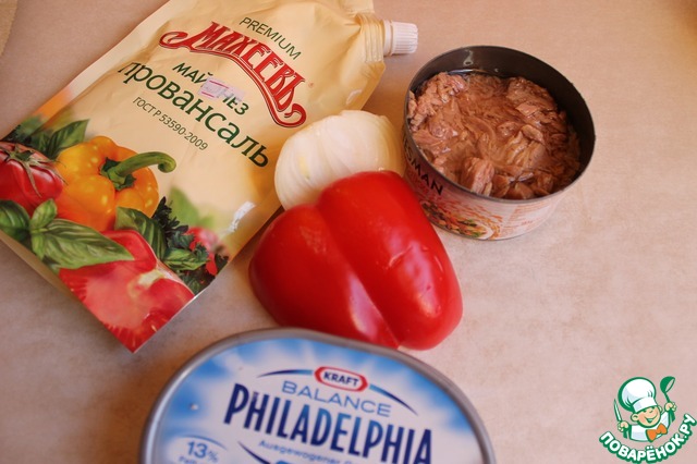 Измельчим луковицу, перец. Сольем масло с консервов. И растолчём вилкой. Теперь смешаем все, добавим сливочный сыр и майонез. Все хорошо перемешаем.