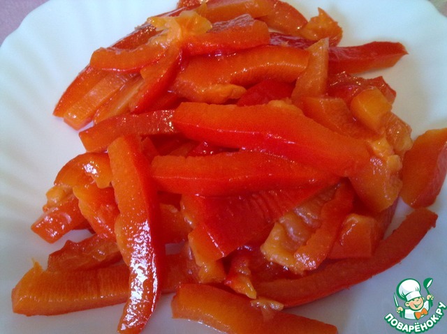 Перец разрезать пополам и удалить семена. Нарезать длинными полосками.