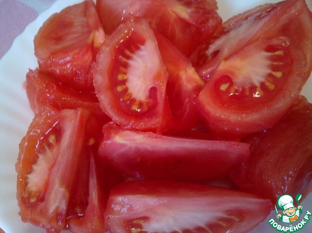 На помидорах сделать крестообразные надрезы и опустить в кипящую воду на 2 мин. Снять кожицу и разрезать на дольки.