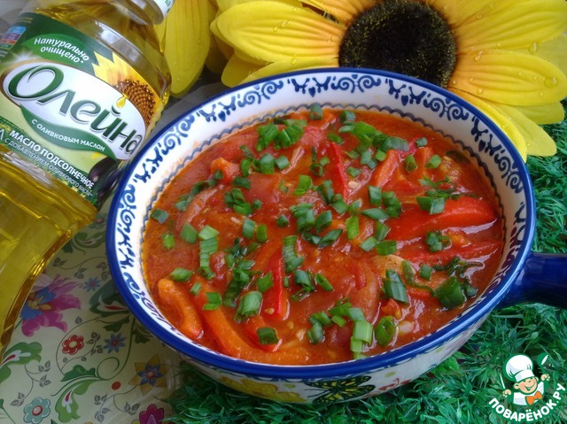 | Очень вкусная закуска. Лучше всего для нее подходят сочные и мясистые красные сладкие перцы и плотные помидоры. Возможно кто то и скажет: " Вкусно, но старо!", все может быть, спорить не буду, однако я хочу предложить вашему вниманию этот рецептик. Скорее, это просто напоминание. Закуска вкусна даже без гарнира, просто со свежим ржаным хлебом! |