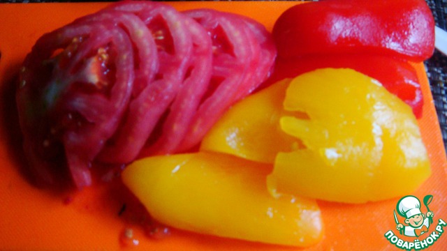 Перцы (уже без кожицы) порезать лепестками, помидоры (кожицу снять, ошпарив) - тонкими кругами.