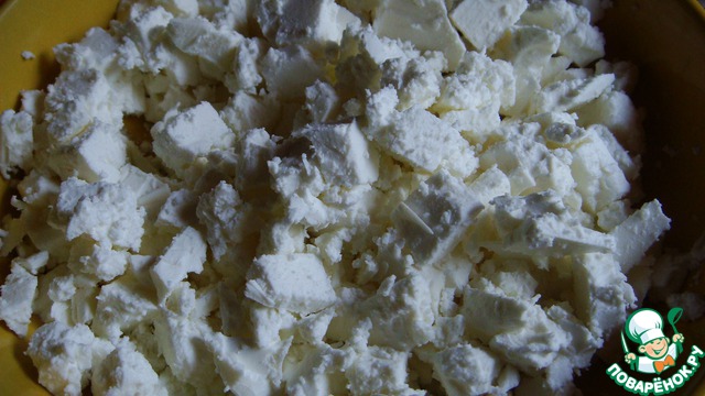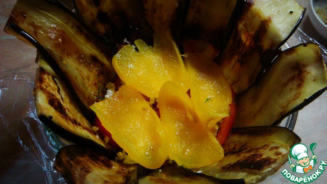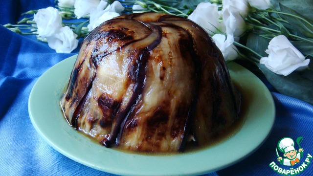 Выстелить кулинарной плёнкой небольшой округлый салатник и выложить на дно внахлёст веером обжаренные баклажаны так, чтобы свисали края.